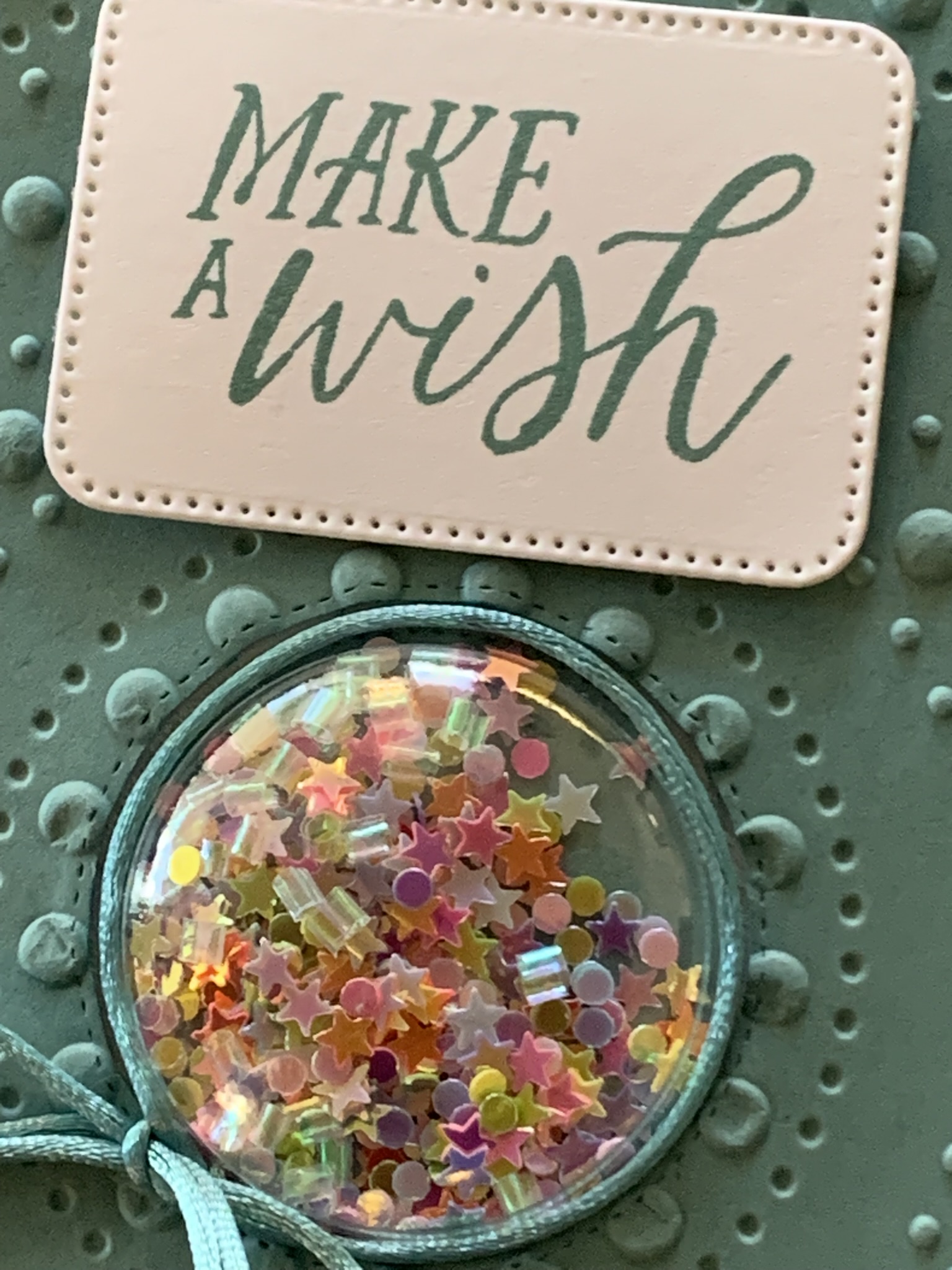 For this shaker card I used the 1 7/8″ circle punch to create the space for a small circle shaker dome. Then I embossed the Lost Lagoon panel with the Dotted Circles 3D Embossing Folder.