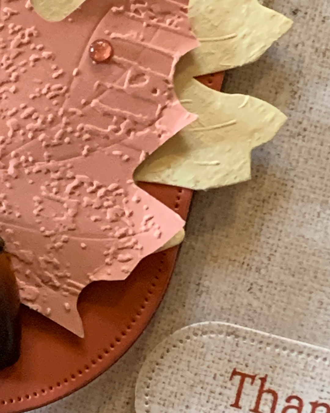 To decorate the front of the ‘door’, I added a Very Vanillla leaf from the kit and embossed a lighter Cajun Craze leaf with the Exposed Brick 3D Embossing Folder. After these were added to the ‘door’ front, I added half an acorn.