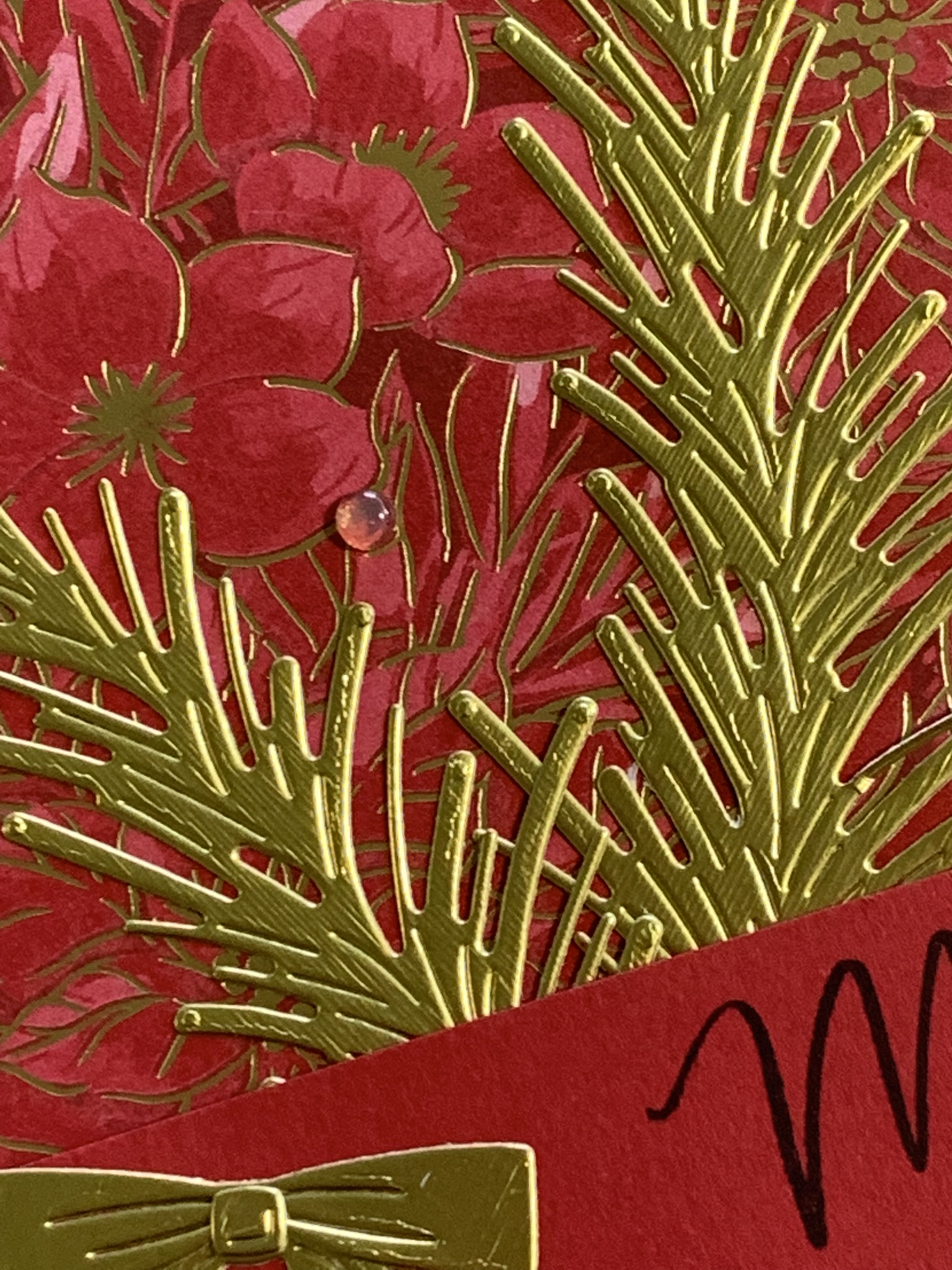 The greeting was stamped in Pecan Pie and die cut. A Real Red banner was also die cut and trimmed before placing behind the greeting. I used Stampin’ Dimensionals to give these layers dimension on the card front.