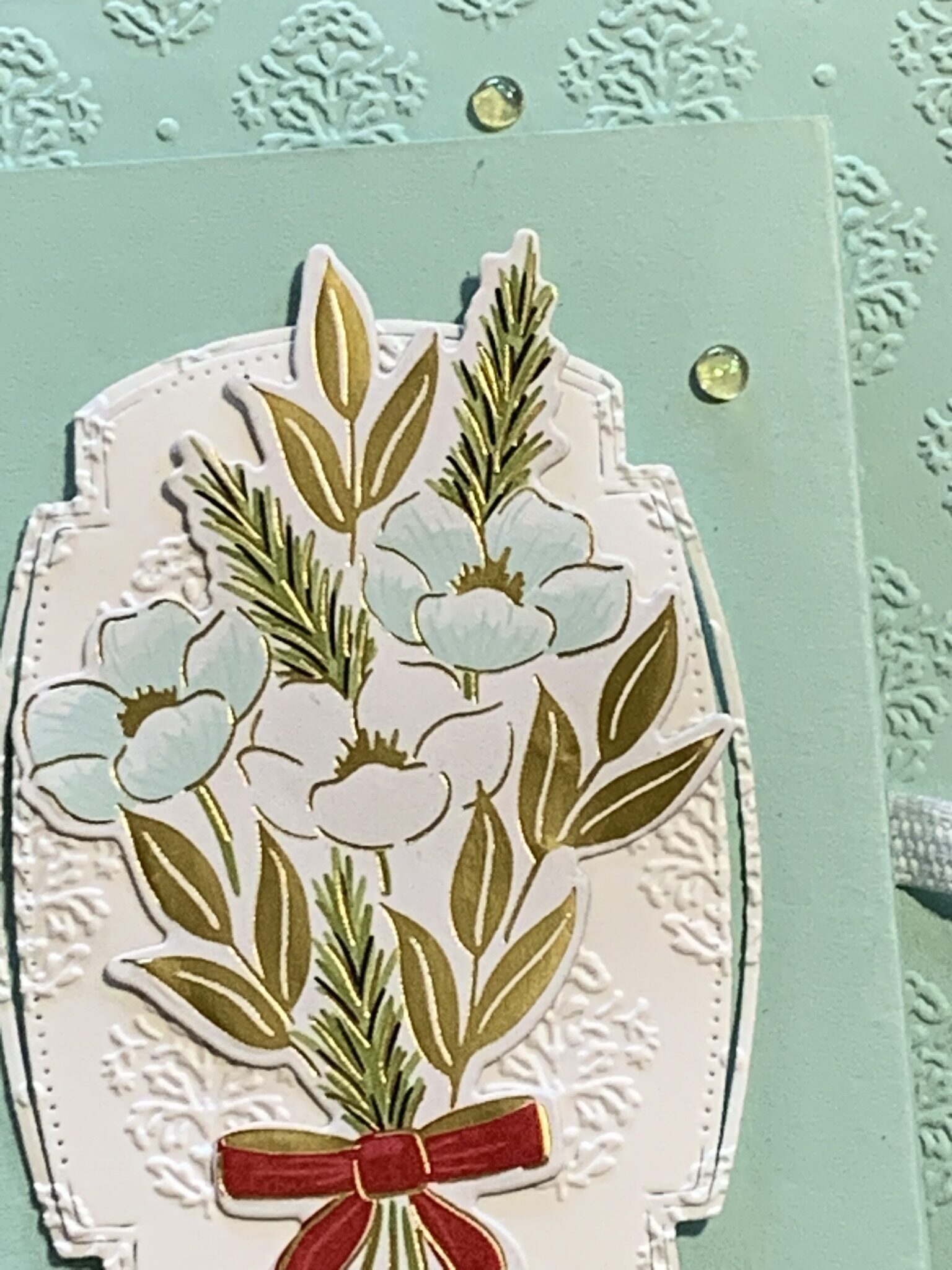 For the front of the card, I adhered a SDSP panel before securing three lengths of the Real Red & White Baker’s Twine.