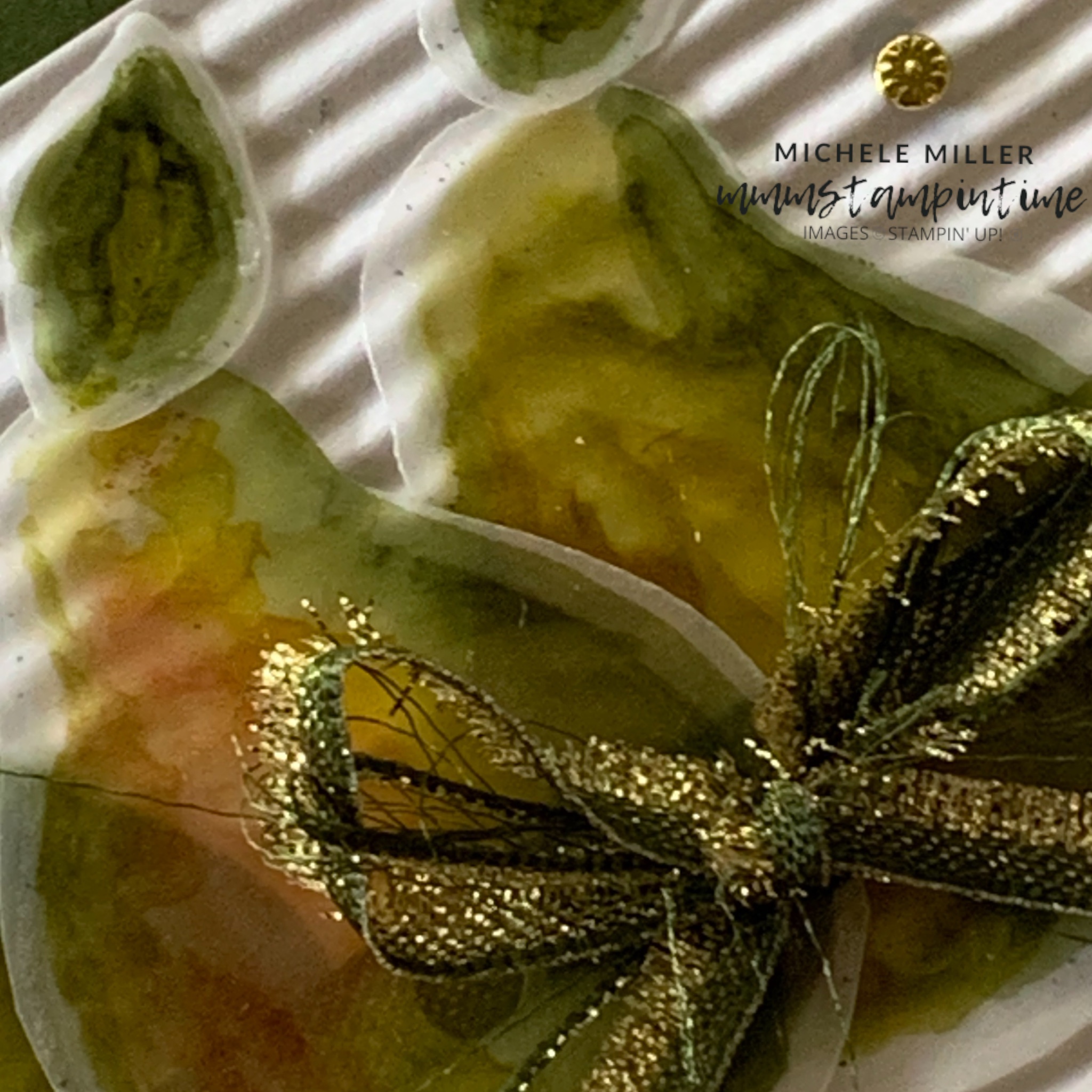 A length of Mossy Meadow & Gold Trim was wrapped around the corrugated white panel. Then, using Mini Glue Dots, I positioned the pears under and above the ribbon. Each of the leaves were then added at the top of each pear.